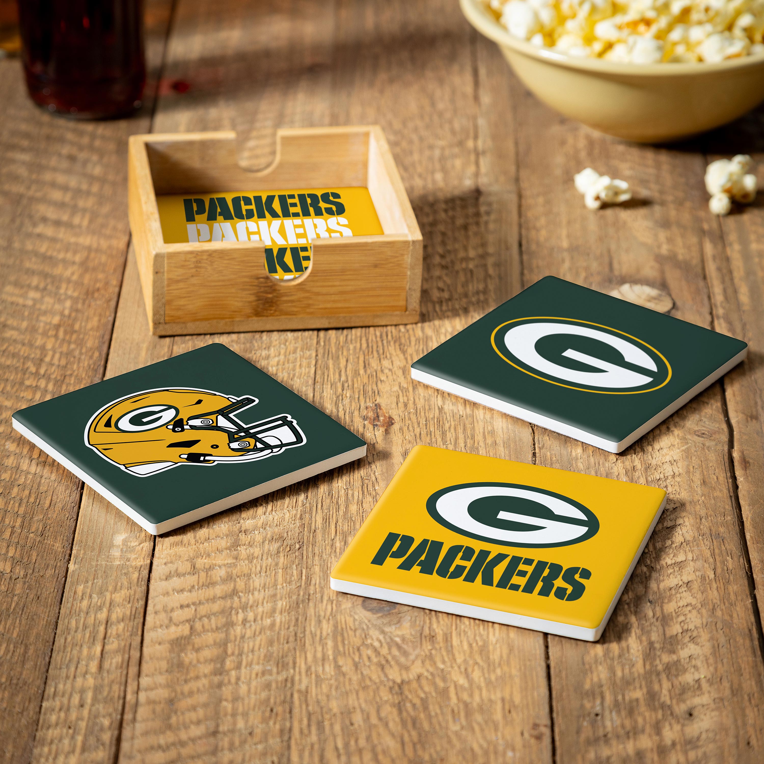 Green Bay Packers Ceramic Coasters Set – 4pcs with Wood Caddy Official NFL Merchandise